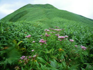 雨の晴れ間、振り返ると七ツ小屋山が見えました。ヨツバヒヨドリも微笑んでくれました。稜線ははや秋の気配。