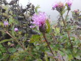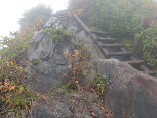 岩場にきた。晴れていたら高度感のある稜線の岩場を登っているのだろう。今はガスって何も見えない。雨飾山だからしょうがない。 笹平に着いた。3人の人が昼食タイムを取っていた。 |