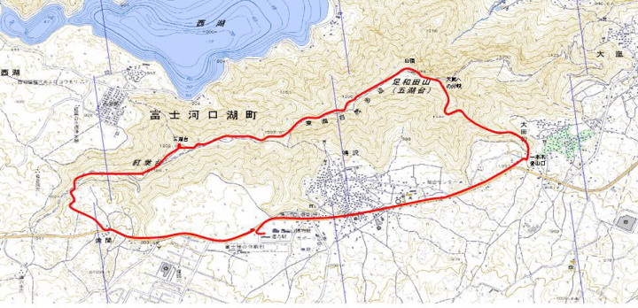 分岐から間も無く山頂(五湖台)に到着する。五湖台とは富士五湖が全て見えるから名付けられたそうだが木々に覆われて河口湖と西湖位しか見えない。展望台も有りしばし富士の絶景を楽しむ。