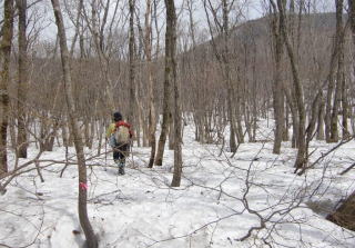 少し深い沢を渡り斜面を登り尾根に出ると残雪が有り方向を定めながらの登りになりました。