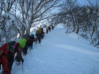 次の難所は山頂へ胸突き八丁の急登です。雪の表面はクラストして堅餅のようです。