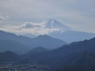 さすが秀麗富嶽十二景の名前に値する富士山。目の前に昨年1月に山行で登った高川山、右奥に今回の最終日に登る三ツ峠山などが展望できる。そして山頂から見下ろす大月の町は、まるでジオラマのようだ。