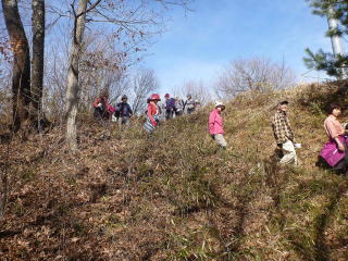 下山は(13:14)猿橋方面の東コースを取る。東コースはこれもまたかなり傾斜がキツく、階段では手すりが付いている。しかし、楽山会のベテランぞろいなので木漏れ日を浴びながら足も揃い快適に下山している。下山中正面に見える山は、1月の山行で登った百蔵山。