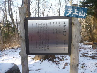 天上山公園・カチカチ山ロープウェイは、太宰治の名作「かちかち山」の舞台だそうで、物語にちなんで、ロープウェイのゴンドラの上や、展望台のあちらこちらに、たぬきやウサギの人形が飾られている。 展望台から富士山を見て感動した後、天上山山頂へ登る。展望台には雪がなかったが、雑木林に入ると雪が残る。ここへは観光客が入ってこないので静かな登山道を6分ほど歩いて天上山山頂(1104m) (15:17)へ着く。 |