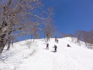 広い尾根に出るとブナの美林帯が続き、真っ白な雪面にほっそりとしたブナの影が美しい。広い尾根なので見える範囲でどこを歩いてもいいよ、と言うリーダーのひと声でみんな待ってましたと、ガシガシ登る。お〜い!待ってくれ〜〜!!