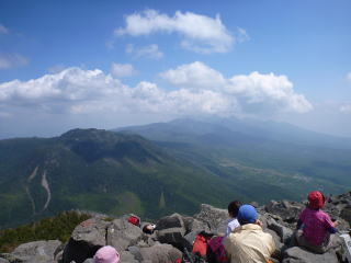 登り始めた頃、下山者から「皆さんも大勢の団体のようですが、上には小学生の団体もいますよ。」と聞かされていたが、頂上へ向かう途中から、にぎやかな声が聞こえてきた。