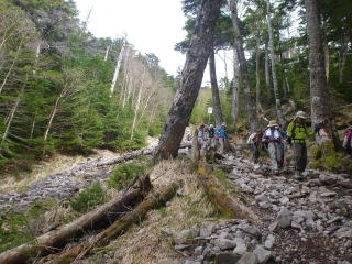 「馬返し」と呼ばれている標高1960m辺りから傾斜がきつくなり、岩がゴロゴロしている道で歩きにくくなるが、この辺はまだまだ楽な傾斜。遅めの歩きなので皆さん足は揃っている。 |