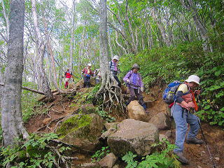 でもそれは想定内、景色のいいところでは何度も休憩を、そして時々振り向き磐梯山の勇姿を。「もうこんなに降りてきたのですね。」と。 |