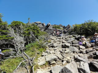 しかし登山道は足元は岩ごろごろ、歩きにくい。周囲は林、眺望なし。入手前の分岐路で昼食タイムとする。 |