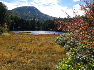 一つ目の池、渋池です。奥にそびえるのは横手山、スキーのメッカだけあって周囲には沢山のスキー場が見えました。 |