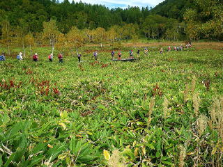 | 田ノ原湿原を行く一行、春から初夏にかけては素晴らしいお花畑なのでしょうね。 |