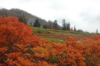 池塘が点在する高谷池湿原の紅葉は見事です。 |