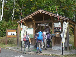 新潟からバスで2時間40分、笹ヶ峰登山口の大駐車場に到着です。準備体操の後、出発です。