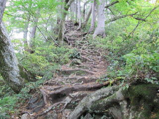 姫子ノ峰までは連続急登りが続き、危険な個所はロープが張られているが、ブナの根っこが多く、姫子ノ峰の下はロープが張られた岩道の登りがあり細心の注意しながら渡った。