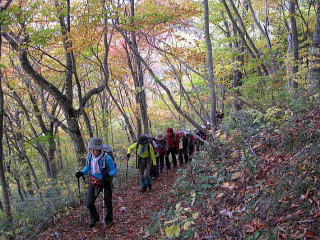 高度差およそ450m、80代2人、70代12人、60代6人のメンバーでもあり、疲れたりバテたりする人が出ないかと心配もしていましたが、それは杞憂でした。登るほどに一層の輝きを増す紅葉に励まされて、どの参加者も元気一杯!。