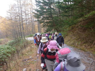 臼窪湿原の木道を歩き美しい落葉松(カラマツ)の黄葉を観賞・後方は湯の丸山 |