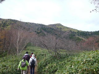 ようやく烏帽子岳の稜線の肩に到着、右に見るゴツゴツした烏帽子岳山頂へ後10分、左に遠く雲を頂く富士山が見え感激、振り返れば湯ノ丸スキー場が黄金色に輝いていました。初めて見る黄金のスキー場にも感激でした。 |
