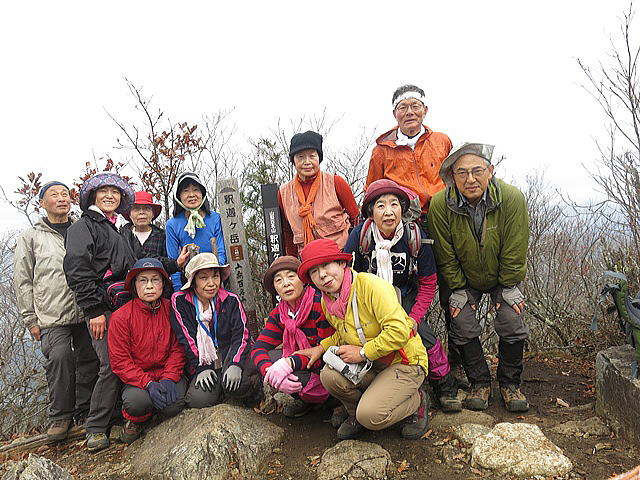 | 黒岳の山頂での集合写真(展望は木々に阻まれ望むことは出来ませんでした) |