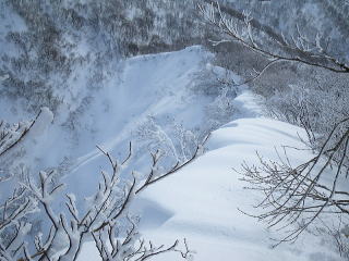 マンダロクへの稜線はこんな道、これに高度差が加わって来ます。雪庇は危険なので、あえて藪に入り、枝を掻き分け進みます。