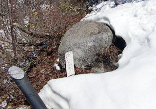 ヒメサユリの開花の時期賑ぎあうヒメサユリの小径も今は雪の下、休憩場所のベンチも雪で傷まない様松の木の幹に縛り付けて有ります。
