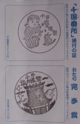 いよいよラストスパート、栂池のスキー宿街を登っていくと本日のゴールが設営されている駐車場に到着、手形に完歩を証明する印を頂き今回の千国街道(塩の道)歩きが終わった。 |