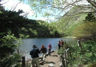 弥陀ヶ池で小休止の後登山口の菅沼に向かう。