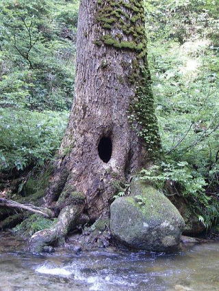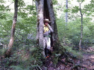 下滝に着きました。段差の低い3段の滑滝で周りは綺麗なブナ林、身も心も洗われる思いで爽快。 |