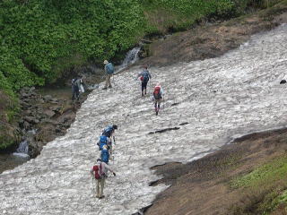 御沢の源流の雪渓上を歩き御沢を渡り御坪で休憩、此処から目の前に雲の上から頭を出した磐梯山が見えました。