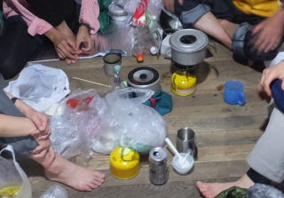 到着した幌尻山荘では管理人さんから「外で着替えて、リュックは持ち込まない…」等の指示を受け、夕食も外で食べるように言われる。