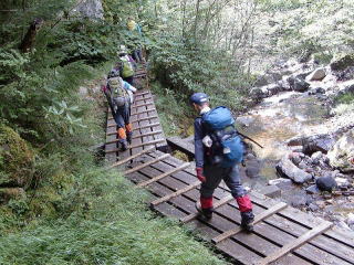 少し時間は長く成りますが南沢コースより歩き易いです。赤岳鉱泉で昼ご飯を食べ気持良い川添の道を下ります。 |