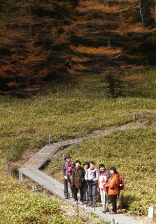 また少し緩やかな登りを上がると展望が開け、眼下に広がるカラマツ林の紅葉がまるで黄金の絨毯を敷き詰めたように鮮やかだった。