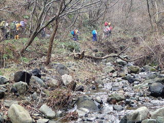 以前は田ノ浦キャンプ場があったという沢沿いの道をしばらく進むと沢を離れて山に取り付く急登が始まった。 |