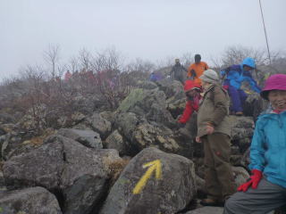 途中、下山者からは頂上は風が強く寒いですよと頂上の状況のお話を聞いていたので、全員雨具を着ることとした。