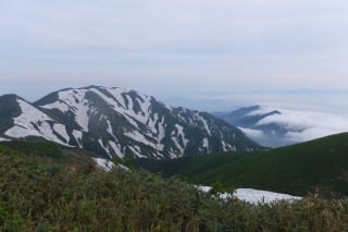 振り返れば朝から歩いてきた稜線、大石山、鉾立峰そして朳差岳がよく観える。