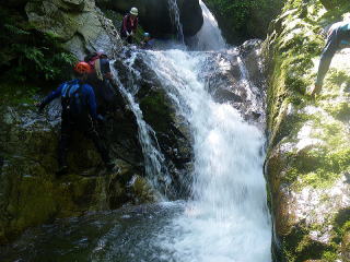 さあ、これからは沢下り、登りとは一味違う楽しさを味わいましょう。滑り台を滑って、猛然と釜に飛び込みます。 |