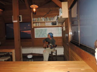 夜も冷え込んできたので小屋に入る。今夜はこれから食堂でランプの灯りの下、小屋のスタッフによるアコースティックギターのライブがある。