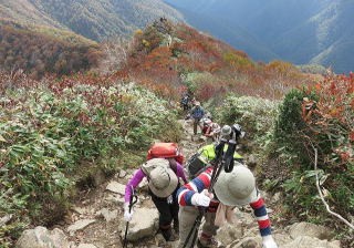 小屋を出発するとすぐ岩場の急登、混雑していてペースダウンを余儀なくされる。 |