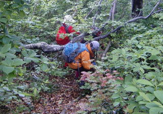 又だいぶ藪に成って居ました。 細い木や切株につかまり必死の登りが始まります。 |