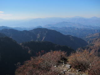 粘り強く色を付けている烏帽子岩の紅葉に足が止まる。振り返ると枝だけの木々をまとった蒜場山が冬の訪れを告げている。 |