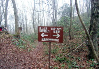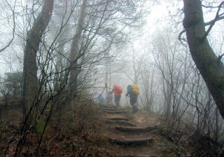 残念ながら続く小雨と濃い霧で眺望も無いことから集合写真を撮って即下山開始。昼食は下山してからとなった。 |