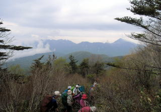 途中休憩時に振り返ると切れ始めた雲から高妻山や戸隠山の山並みが観えてきた。