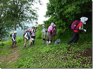 わらび採りに道草して遅れた分を取り戻そうとするリーダーについて行く
