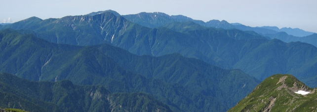 | 本峰登山道からの展望、手前中岳の後方に、左から伊那前岳、宝剣岳そして空木岳 |
