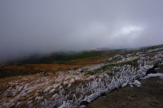小屋の回りの草原はベージュ色に染まった上に真っ白な霧氷が付着、枯草に白い華が咲き乱れておりました。