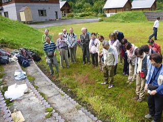 銀山平森林公園へバスで移動しました。さっそく公園広場の階段を利用して御幣とお神酒を祀り、日頃の山への感謝とこれからの安全を願い神事を行いました。