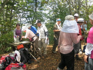登山の安全を祈念し、におさがりのお神酒を皆で頂戴しました。 |