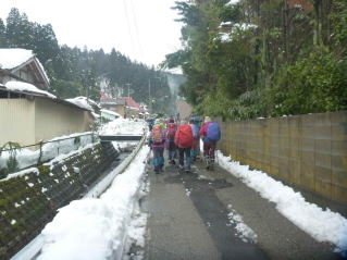 川内の集落に着くとさすがに屋根には多くの雪が積もっていた。川内は早出川下流の平たん部に位置し、ここから舗装道路を川に沿って遡って行くと早出川ダムに至る。「雷山」は川内山塊の一番手前の山である。