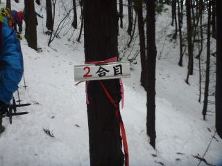 3合目と6合目で休憩をとる。低山だけに展望はきかないが冬山の雰囲気は堪能できた。周囲の風景に気がつくと、杉林と雑木林が登山道を挟んで左右に分けられている。私にはこれがどんな意味があるのかわからない。