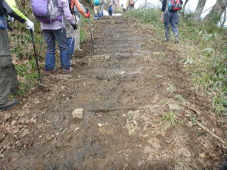 多宝山の山頂付近は雪解け水の泥で滑りやすい。