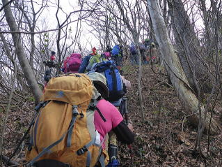 山頂近くになると今度は藪漕ぎです。綺麗な黒モジの木の芽が出ています。